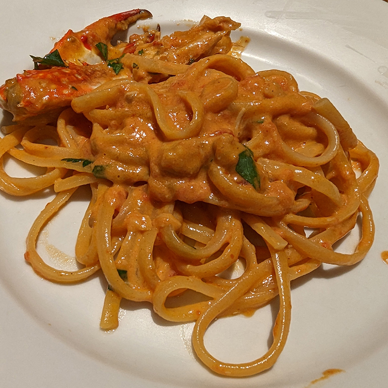 リゾットはフレッシュで軽やかな味わいで、ラザーニャはボロネーゼとトマトの酸味がいいアクセントになっている。特筆すべきは渡り蟹のリングイネで円やかかつコクがあって香り高い逸品。
