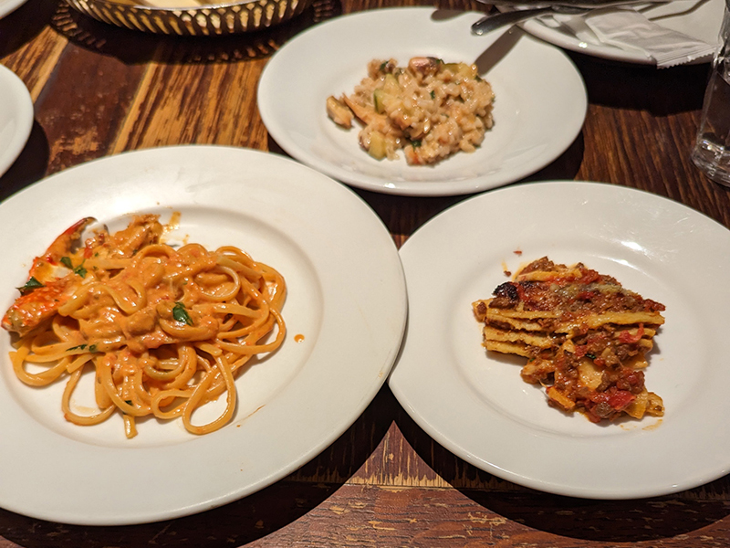 サービスの方が取り分けてサービスしてくれるところが嬉しい。左下から時計回りに「丸々一杯渡り蟹のトマトクリームソースリングイネ」「魚介類とズッキーニのトマトリゾット」「自家製ラザーナャ」の順。前菜以上に手が込んでいて、どれもなかなかのクオリティ。
