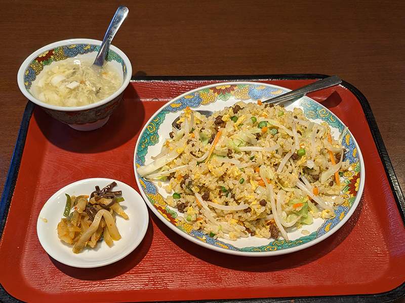 最初にチャーハン、スープ、漬物が供された。レタスだけではなく、もやし、人参など実に具沢山。これはちょっと想定外。それに結構なボリュームである。