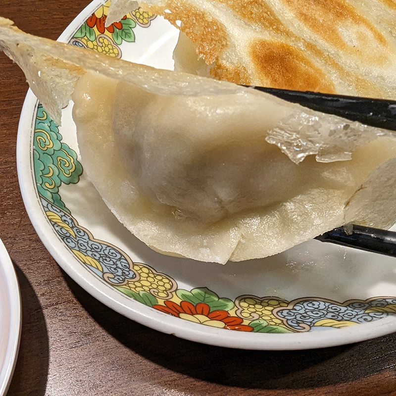 チャーハンを半ば食べ進んだタイミングで登場。崩すのが勿体ないほど羽根がキレイで食欲をそそられる。皮は厚めのしっかりとした食感で、餡は肉と野菜のバランスがよく、ジューシーな仕上がり。