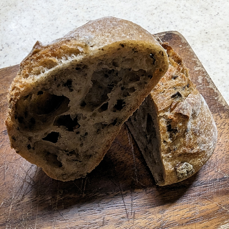 所謂、パンはカンパーニュ。皮はパリッと香ばしい。中は細かく刻んだオリーブが入っているせいか、食感にザラつきがあるが、加水多めでしっとり感もある。天然酵母を使って時間を掛けて発酵したものだと思うが、粉の旨味が感じられる素朴な美味しさ。