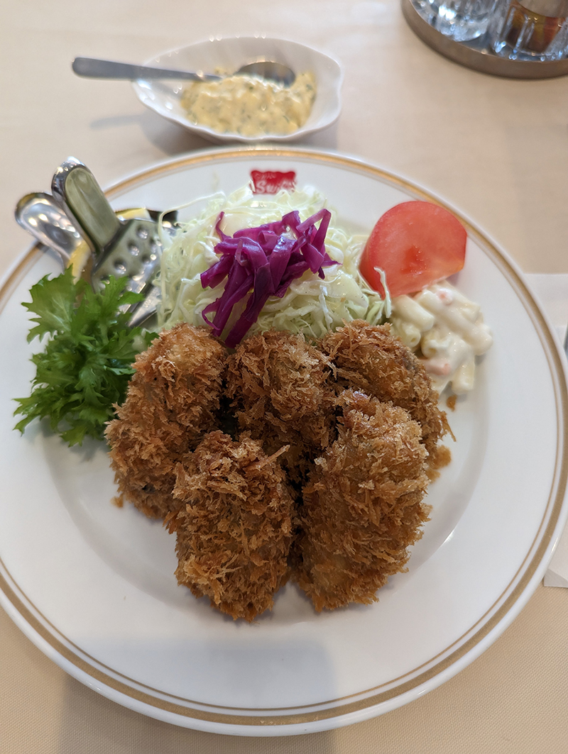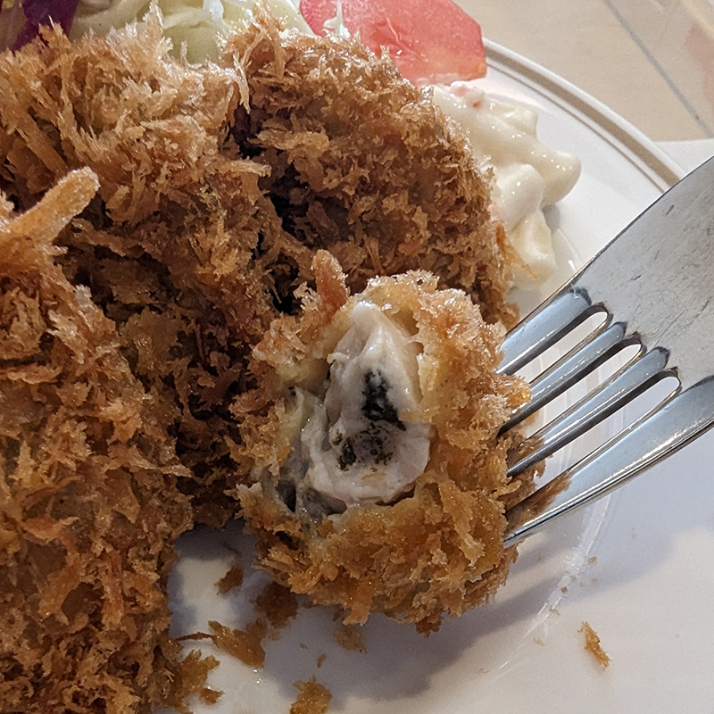 粗目のパン粉を使っているが油切れがよくサクサクとした小気味いい食感が心地いい。カキはミディアムレアの火加減で丁度いい塩梅。