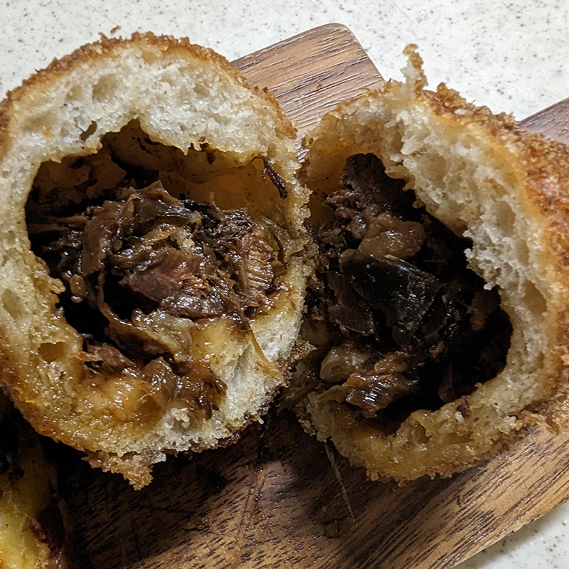 肉はとても柔らかく味も良く染みている。かなりピリ辛仕様になっているが、カレーパンと差別化するためにもここまで辛さを出さなくても十分に美味しいのではないかと思う。