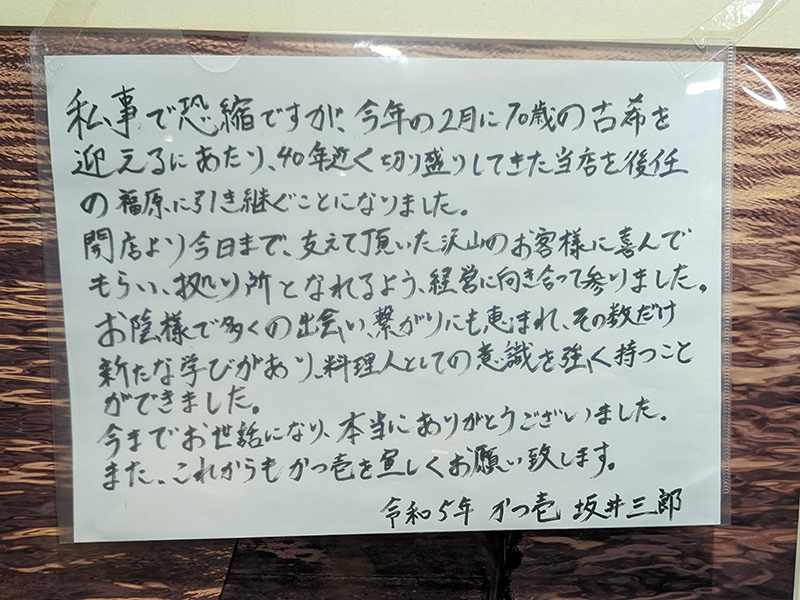 前回はなかったが、お店の前にはご主人のメッセージが貼られていた。