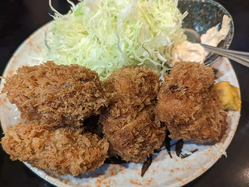 あまり食べた記憶のなかったカキフライを、と思っていたらヒレとのコンビネーションがあることに気づき、こちらをお願いした。因みにカキフライ単体なら6個付いてくるらしい。こちらはその半分。むしろちょうどいい量といえる。