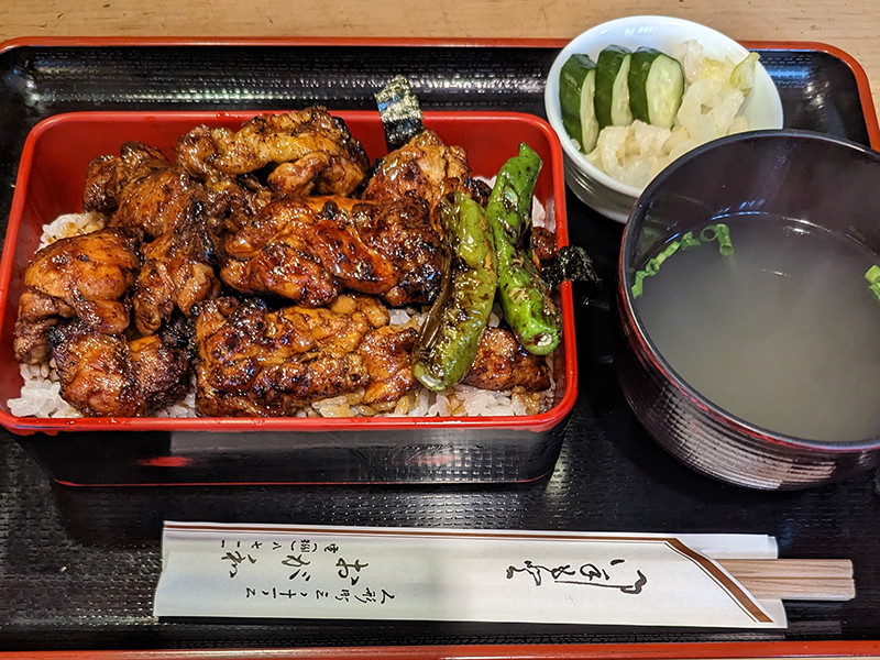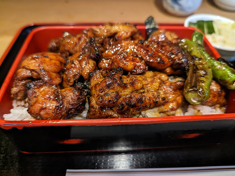 蓋を開けるとたっぷりとタレが絡まった鶏肉が所狭しと並んでいる。これならば肉増しは必要はないだろう。焼鳥重はもも肉とむね肉、それにししとうが入るのみの至ってシンプルな構成だ。