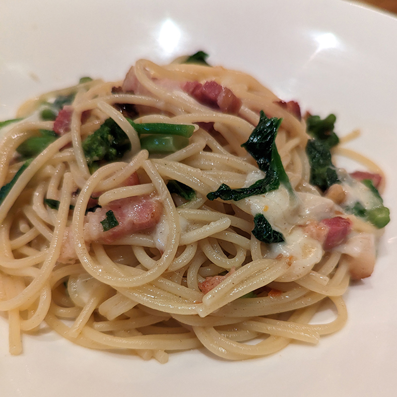 ペペロンチーノにイベリコ豚と菜の花、モッツアレラチーズを使ったパスタ。ペペロンチーノにしては随分と具材たっぷりだったので興味があって試してみました。