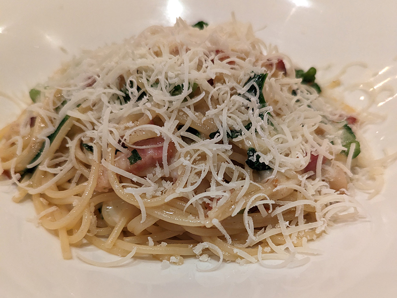普通ならペペロンチーノに粉チーズは使用しないところですが、モッツアレラチーズを使用しているので別途粉チーズを掛けてもらった。こちらのお店では店員さんがその場で削りたての粉チーズを掛けてくれる。