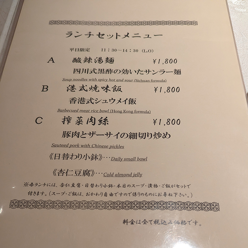 ランチメニューは全部で3種類。サンラー麺とシュウメイ飯が定番で後のひと品が日によって変わる。