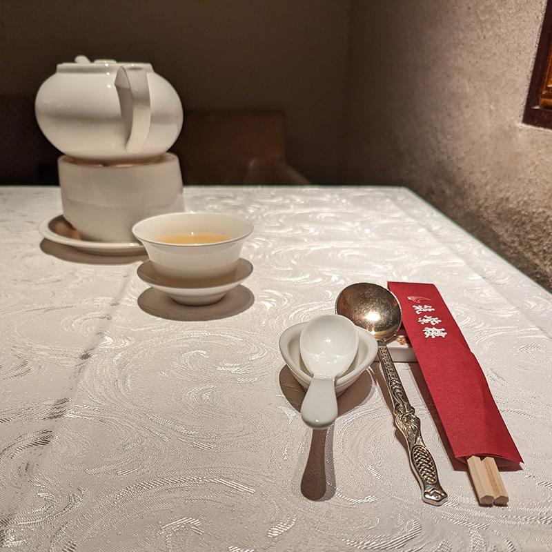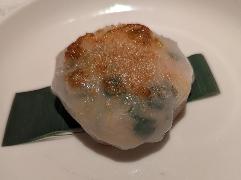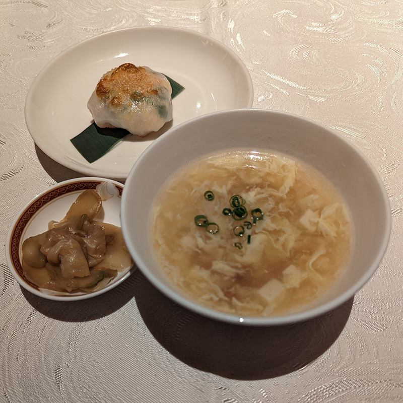 最初にスープとザーサイに日替りの小鉢として海老焼き饅頭が運ばれた。スープは上湯に貝柱などの乾物の旨みが溶け出た滋味深い味わい。こちらはおかわりすることも可能で実際におかわりを頂いた。