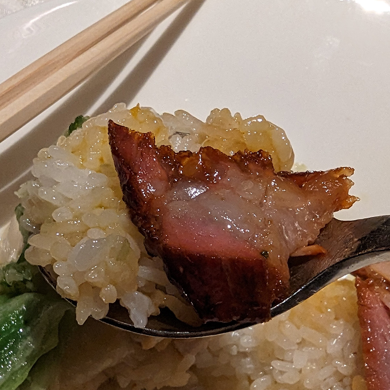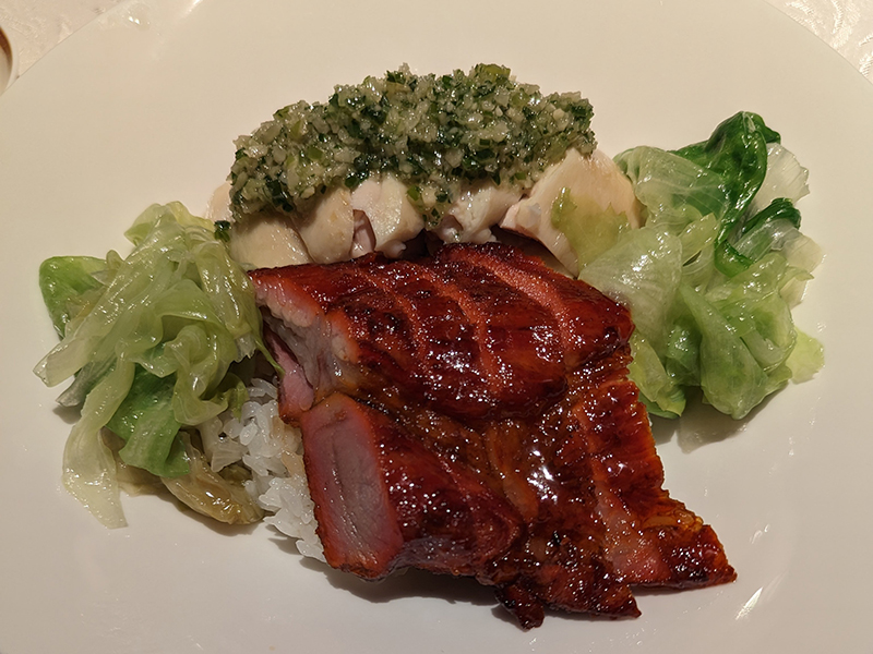 香港式シュウメイ飯はご飯の上に叉焼と蒸し鶏が乗り、両サイドを付け合わせの茹でキャベツが彩る。