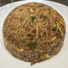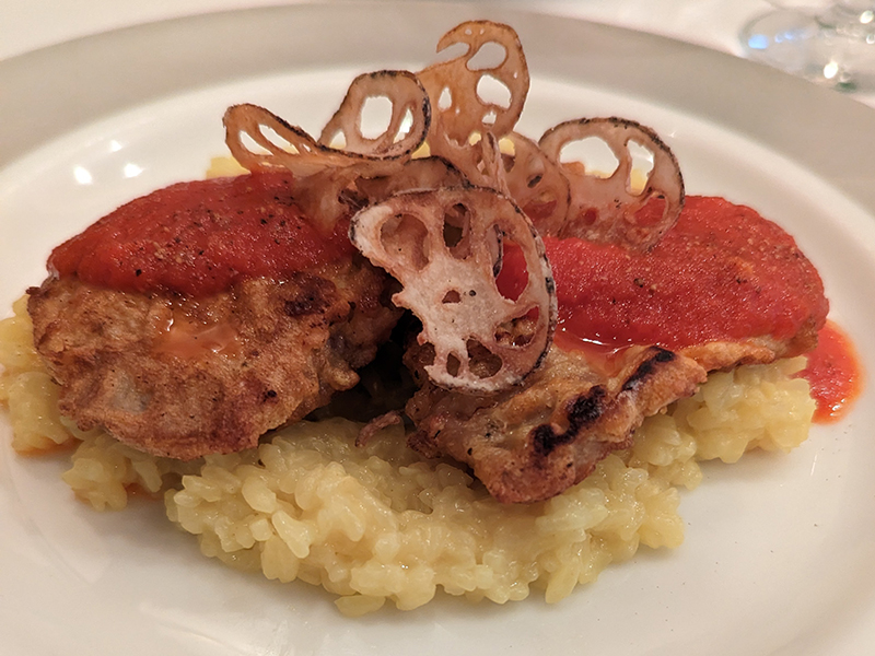 サフラン香るバターライスの上に玉子の衣をまとったピカタ、更にその上にレンコンチップが乗る。