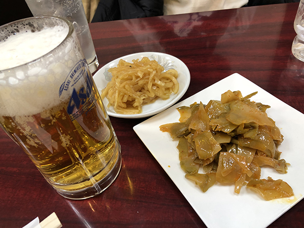 まずはビールと搾菜とおまけで頂いた大根の漬物