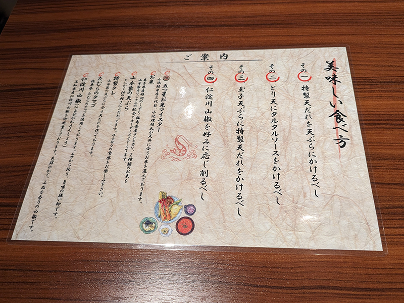 天丼の食べ方なるメニューがあって、それによると天丼と玉子天にはお客自らが特製の天ダレを掛け、とり天にはタルタルソースを、更にお好みで仁淀川産の山椒を描けるというもの。食材にもこだわりがあって、お米マイスターが選んだ天丼にあうお米やたまごなどを使っている。