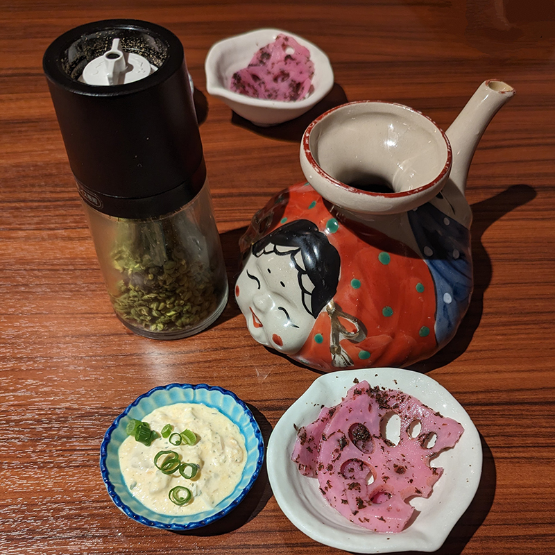 まず最初に山椒、特製天ダレ、お漬物、タルタルソースが登場。