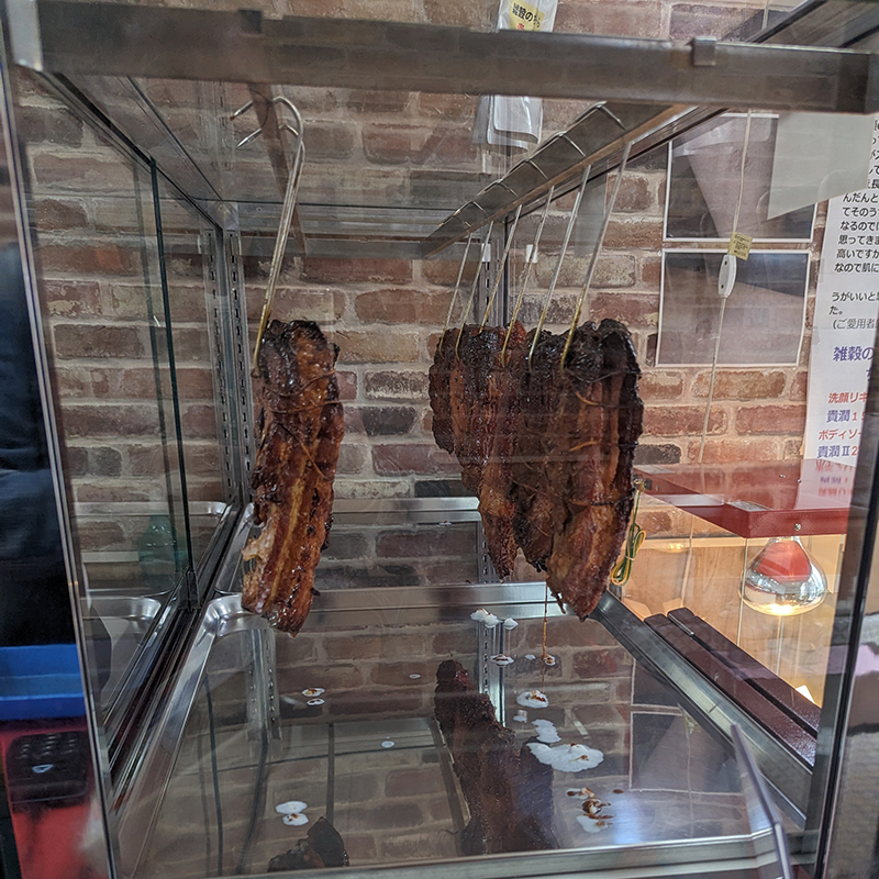 店内に入るとショーケースにはバラ肉と肩ロースのチャーシューが潤沢に吊るされていて、どれも色艶がよく、見るからに美味しそうな面構え。