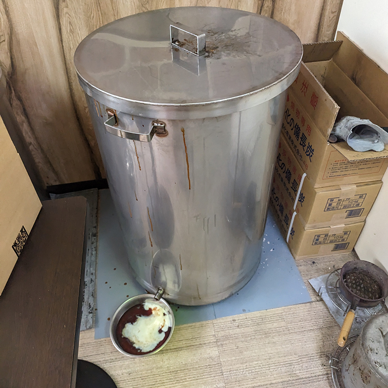 こちらの寸胴の中でチャーシューを吊るし、炭火の遠赤外線効果で約6時間ほどじっくりと火を通していく。溶け出した余分な油は寸胴の脇に置かれた容器に溜まる。