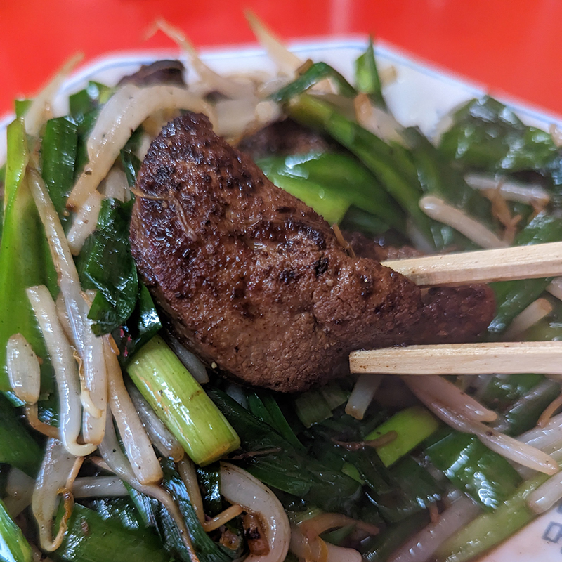やや濃いめの色合いでニラがたっぷりと入っている。野菜はシャキシャキとした歯ごたえで、味付けは見た目ほど濃すぎない。