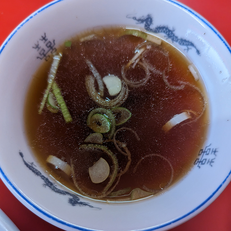こちらにはスープが付いてくる。すっきりとした昔ながらの東京ラーメンの趣き。恐らくラーメンもこのベクトルなのだろう。このスープでラーメンのイメージが何となく掴めると思ったので、今回は敢えて炒め物とチャーハンの組み合わせにしたのだが、結果的に正解だった様だ。