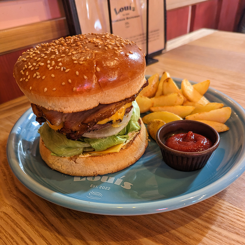ぎっしりと敷き詰められたレタスの上にパテ、チーズ、厚切りのベーコン。ポテトと自家製のケチャップは全ての料理に付いてくる。パテは食べ応え十分で、肉の旨味もしっかりと感じられる。チーズがパテと密着していて一体感があるところが面白い。