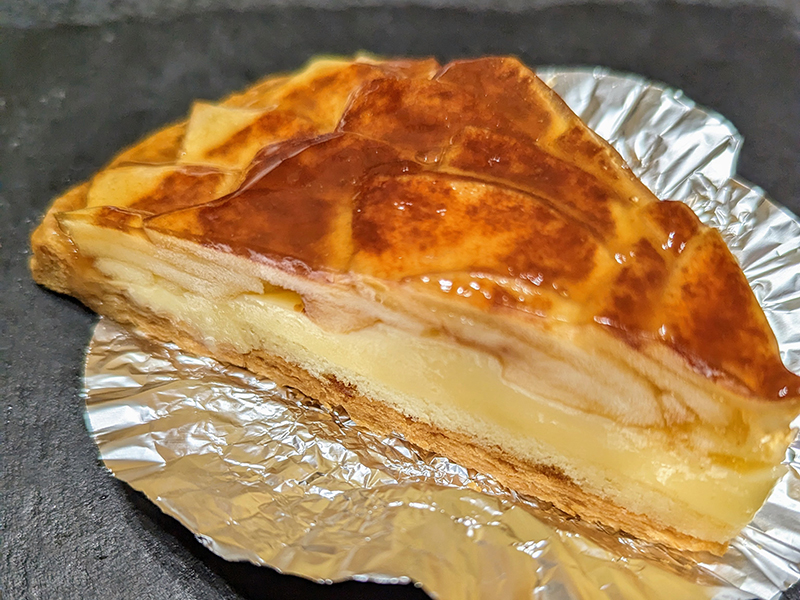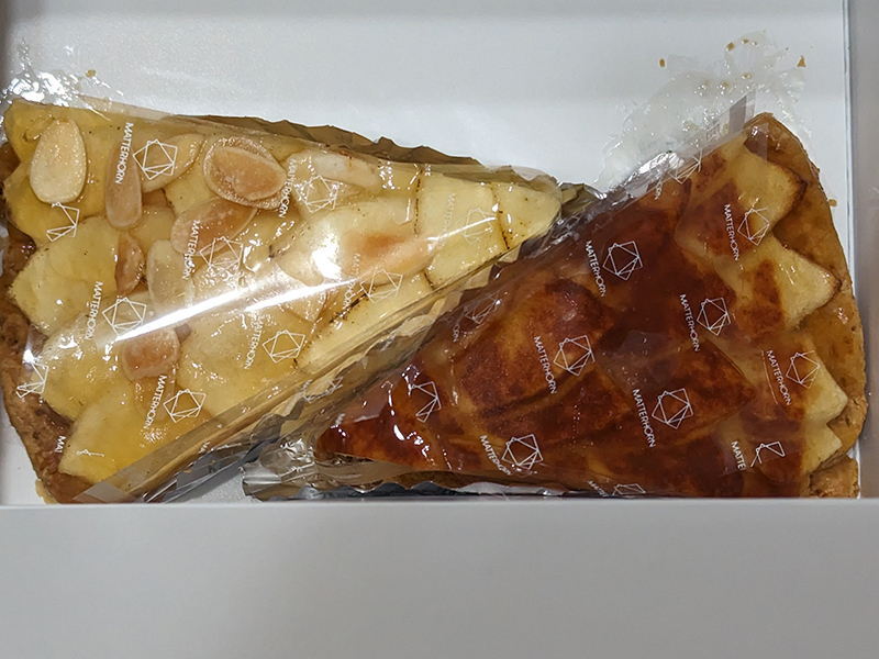 いずれもりんごがパイに内包されておらず、土台のパイの上にはカスタードがあり、その上にりんごが乗っているのが特徴で、カスタードが入っているが故に賞味期限が短いのだろう。