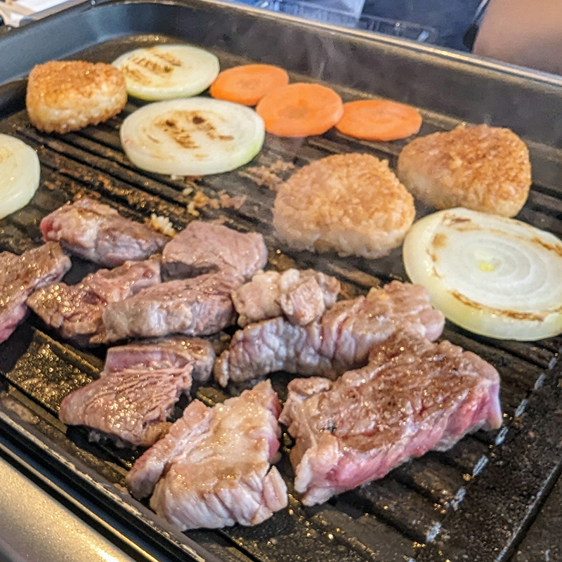 お肉は大きなステーキ、牛肉、豚肉、ハム、ソーセージ、海老、帆立、焼き野菜、焼きおにぎりと想像以上に盛り沢山。正直、チケット代を考えたら少ないのだろうと考えていたら食べ切れないほど量がある。