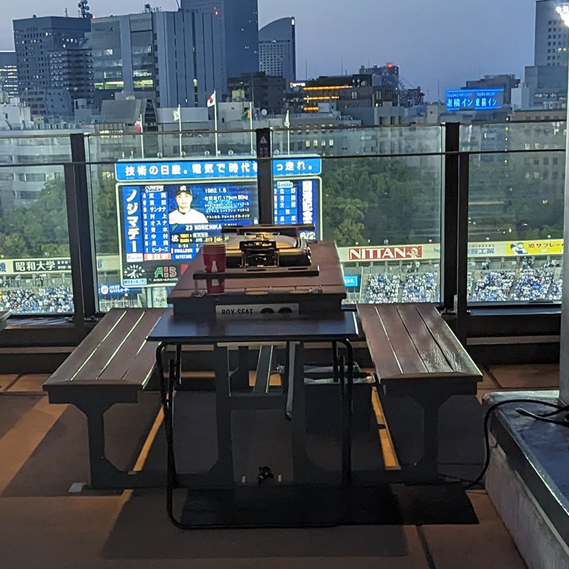バーベキュー席はバックネット裏の最上段にあって、エレベーターを使ってアクセスするのでとても快適。