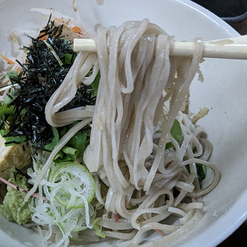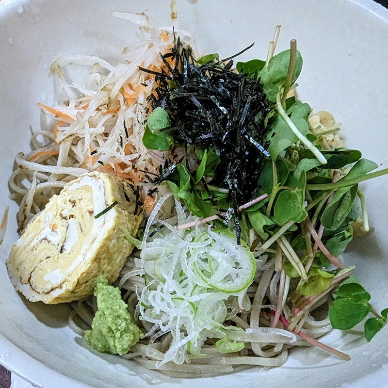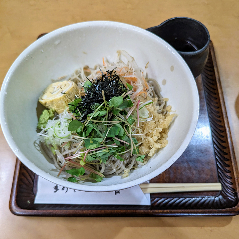 こちらはぶっかけスタイルで頂く。前回頂いた時に比べてそばの香りは落ちているが、これだけの具材に囲まれるとこれはこれで楽しい。これからの季節には打ってつけのひと品。
