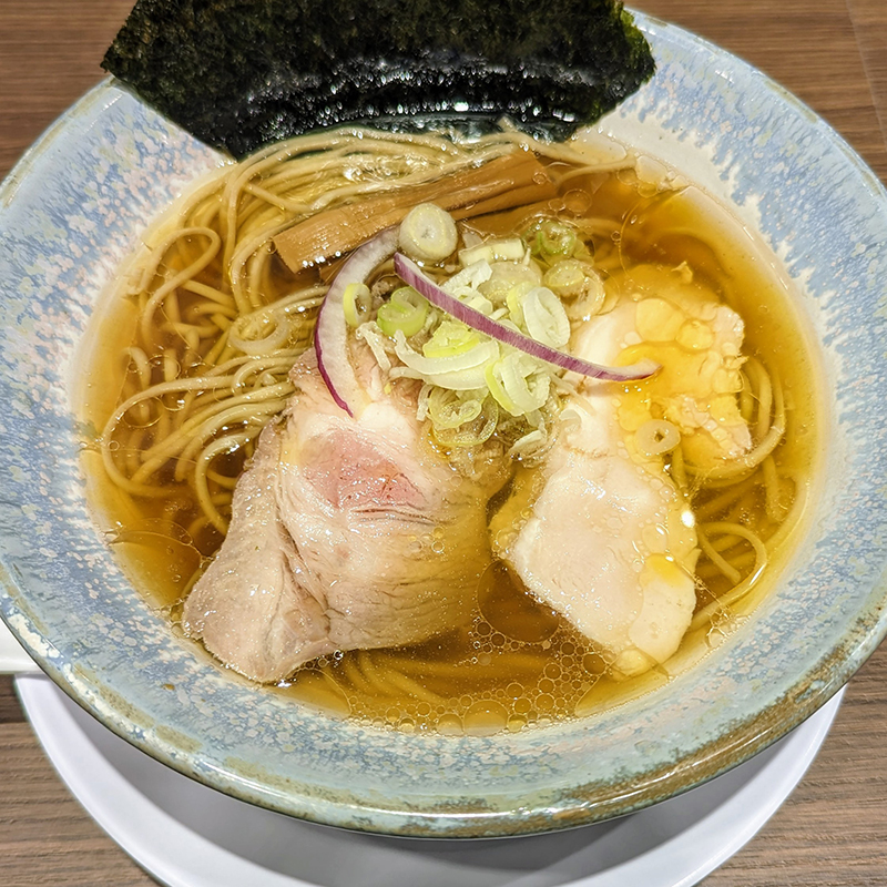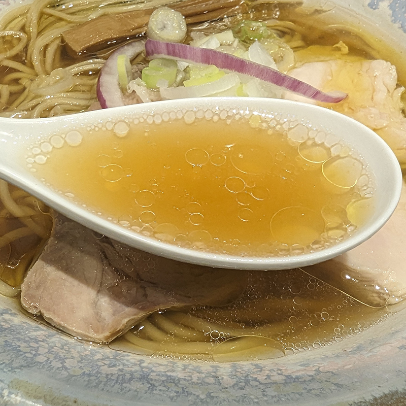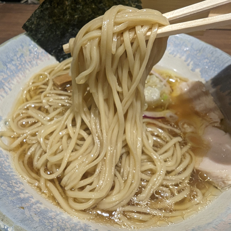 一見、塩かと思われるくらい色が薄くクリアなスープ。見た目ほど塩気は弱くはない。いくつもの出汁の旨味が幾重にも重なっていて奥深い味わい。