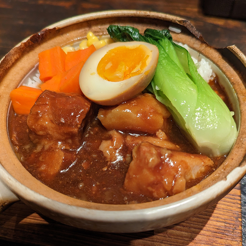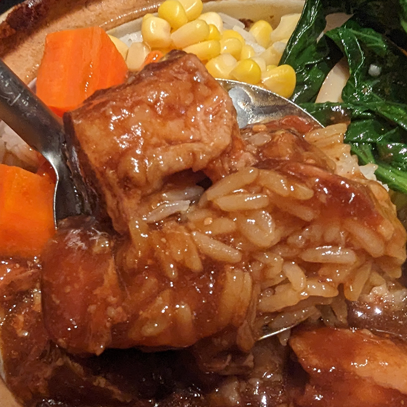 土鍋は豚バラ肉の煮込みでごはんの上に豚バラの餡かけが掛かっている。