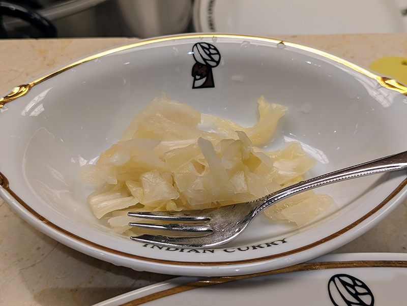 そのため、カレーだけだと途中で飽きてしまいそうになるが、合いの手としてキャベツのピクルスが大切な役割を果たす。少し甘めの味付けだが、ほどよいアクセントになる。