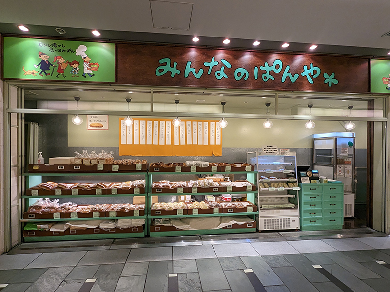 惣菜パンや菓子パンが通路に沿ってところ狭しと並んでいる。