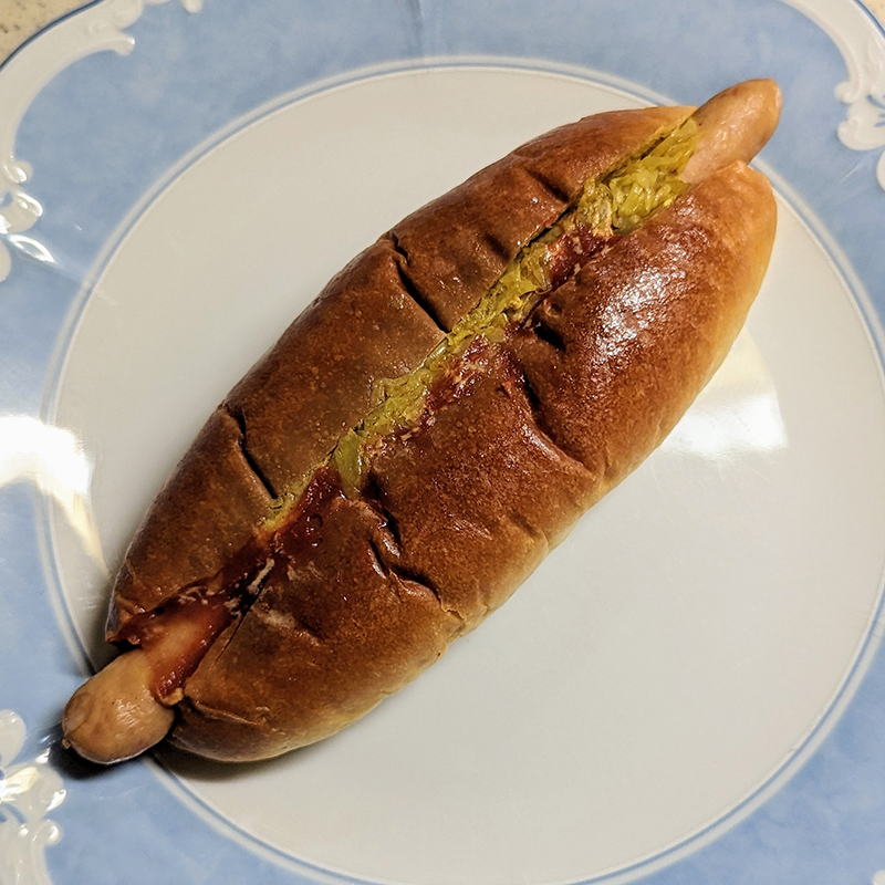 所謂、ホットドッグだが、キャベツにカレー風味の味付けがされているところが特徴でこれがいいアクセントになっている。パンそのものは甘みが感じられるものの少しもっそりとした食感。