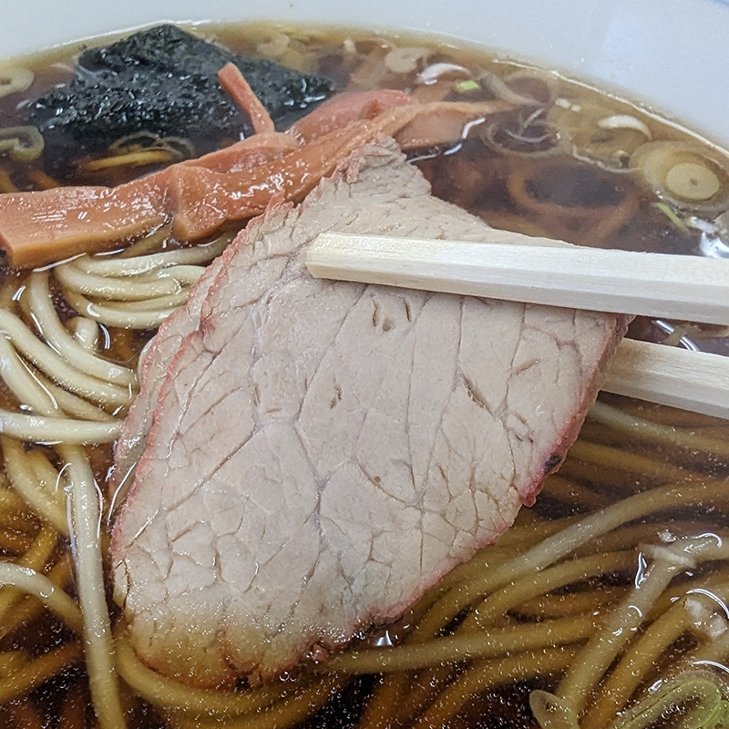 チャーシューとメンマはピンク色に染まっているのが特徴で、しっかりと焼いたチャーシューを供する。