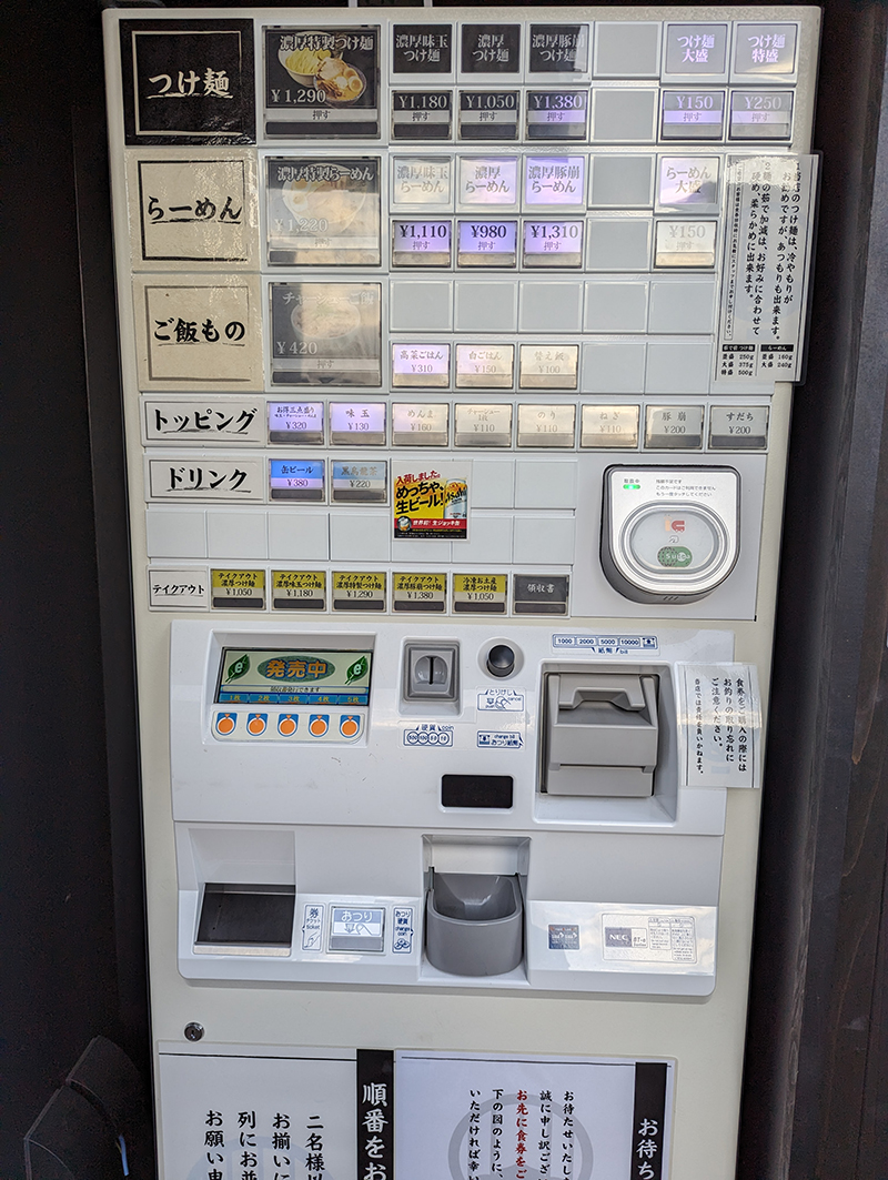 狙いは開店前だったが、少し出遅れ開店3分前に到着。営業中は食券を購入してから列に加わるシステム。開店前は食券が買える様になるのは直前なので開店前はそのまま列に加わるのが正解だ。