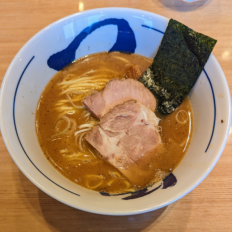 三河屋製麺の中太麺はちょうどいい塩梅の茹で加減でスープとの相性もいい。