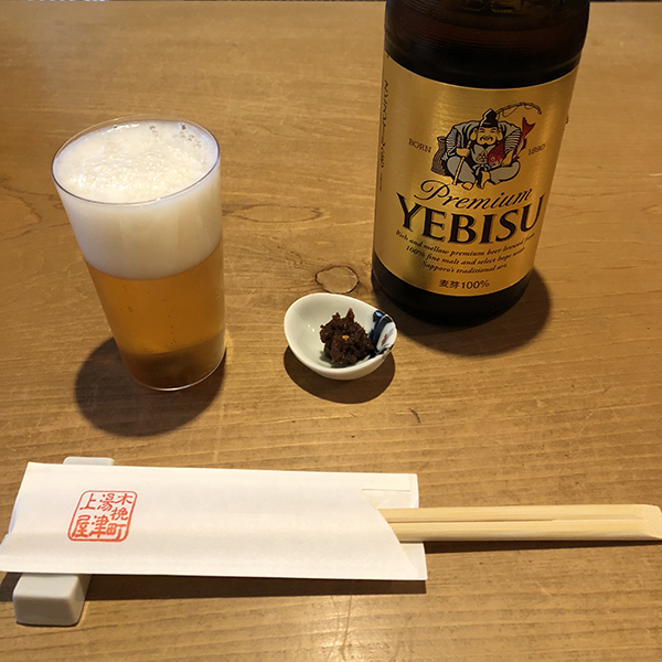 まずはビールで喉を潤す。一緒にお通しの味噌が供される。