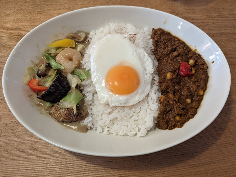 トッピングには目玉焼きを。これはキーマカレーとの組み合わせるのが目的でグリーンカレーには余り相性がいいとはいえない。この組み合わせは彩りも鮮やかでどこか春めいていていい。