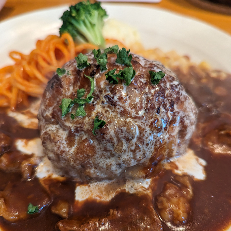 デミグラスソースがたっぷりと注がれているのは嬉しい。ハンバーグは厚みがあり、ナイフを入れるとじゅわっと肉汁が溢れ出す。デミグラスソースはしっかりとコクがあってバランスがいい。