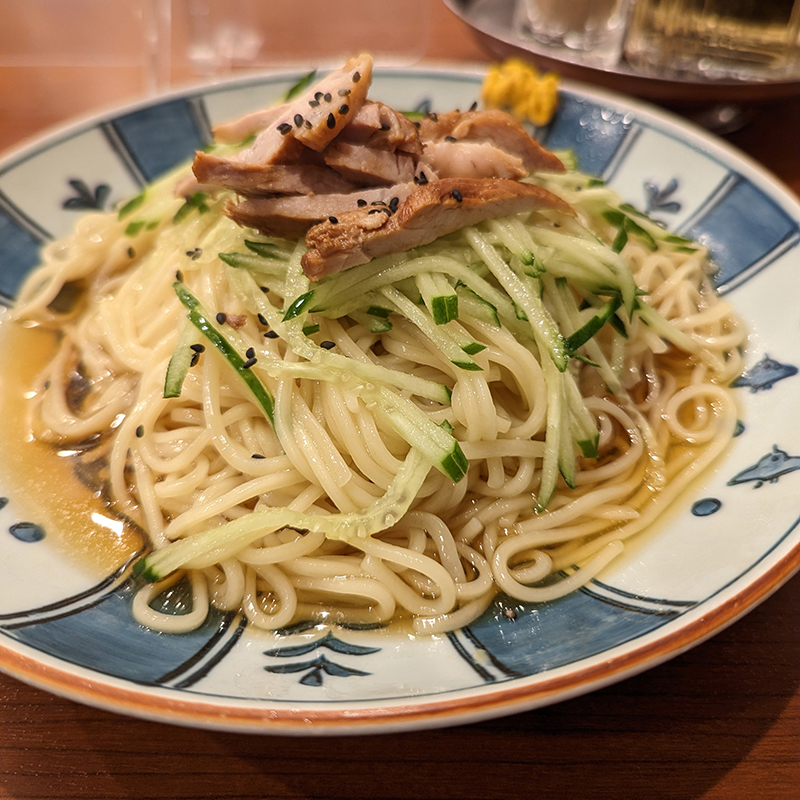 冷やし中華を頂くのは何年ぶりだろうか。具材はきゅうりとチャーシューのみと至ってシンプル。他に黒ゴマが掛かっているのが特徴だ。一般的な冷やし中華と比べてもタレの色はかなり薄い。