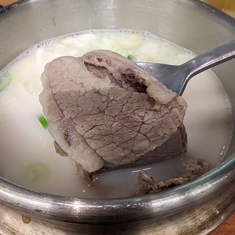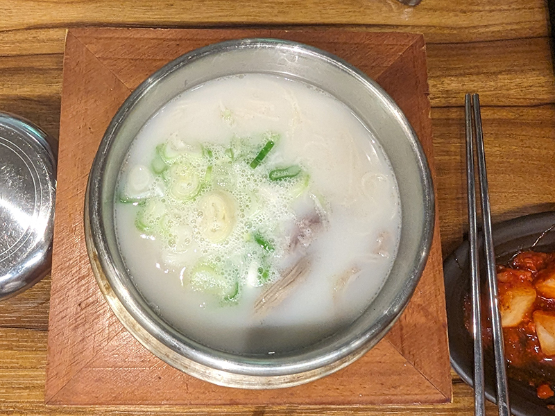 ソルロンタンは味付けを施されていないので塩を入れて各自調整する。スープははっきりとした白色だが、サラっとスッキリした味わい。上品と言えば上品だが、もう少し濃厚さやコクが欲しいところ。