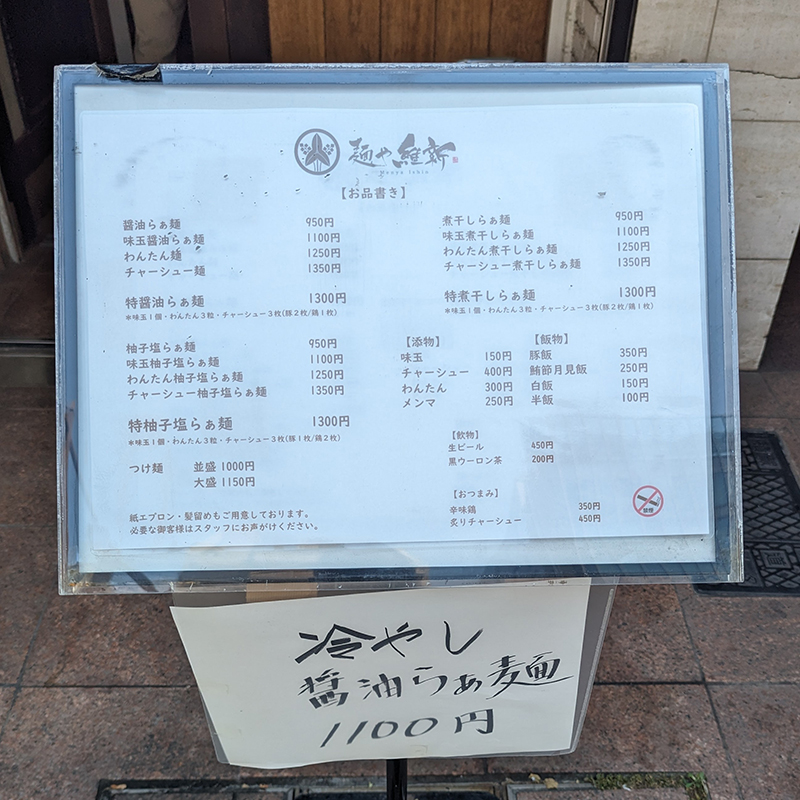 少し前からお店の外に置かれた立て看板のメニューに冷やし醤油らぁ麺のお品書きが追加された。