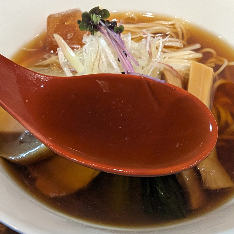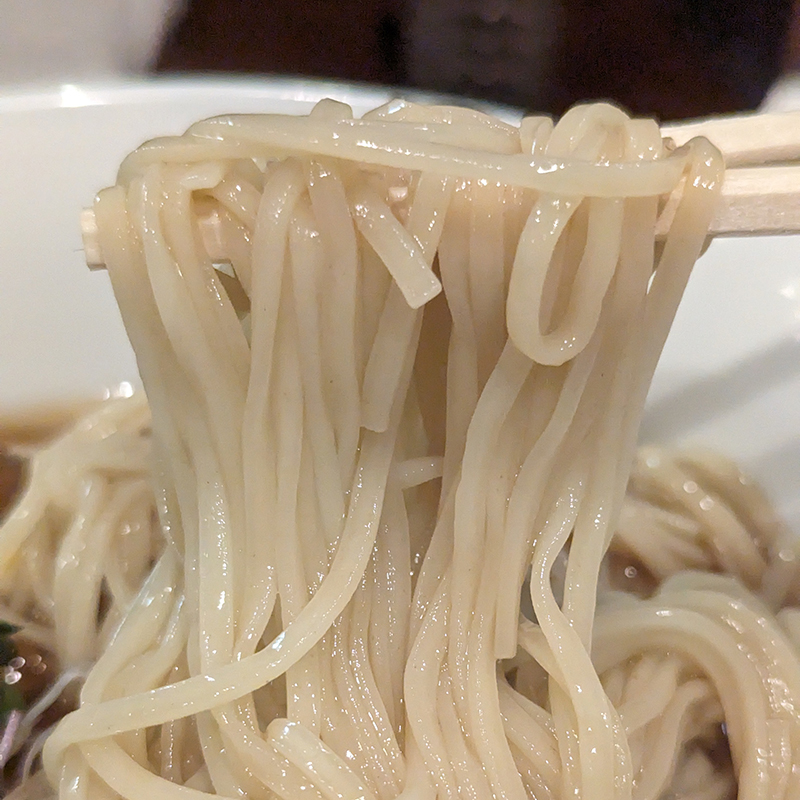 スープの色は温かいラーメンとの違いはほとんど感じられない。出汁は丁寧に取られている感じがするものの冷やすことでどうしても苦味成分が感じられる。こちらのお店に限らず冷やしラーメンとしてはこの辺りが難しいのだろう。