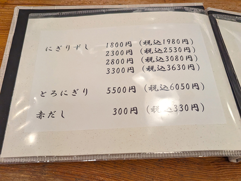 江戸前の握りらしく酢めしにはしっかりと酢が効いて、ネタには煮切りを塗ったものを供する。特に玉子が秀逸でふんわりと柔らかくほどよい甘さ。巻物がかっぱ巻き、鉄火巻、白身の紐といった具合に三者三様なのも面白い。