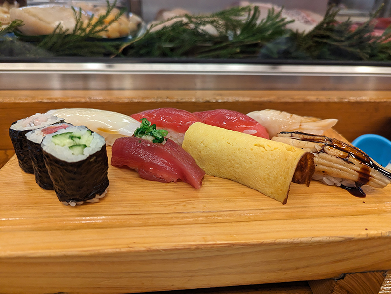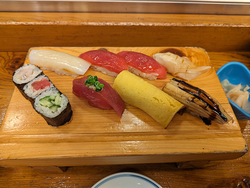 握りはイカ、まぐろ2貫、貝、かつお、玉子、穴子の全部で7貫。これに3種類の巻物が付く。量としてはいささか少なめであるが、値段とクオリティのバランスを考えれば無難にまとめている印象だ。