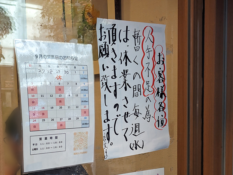 いよいよ次という順番の時に入口の貼り紙を見ると「人手不足のため暫くの間、毎週水曜日はお休みとさせて頂きます。」と書かれていた。