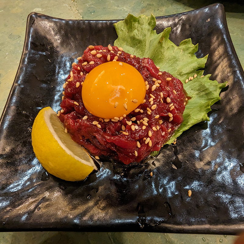 まずは前菜代わりにユッケから。こちらは桜肉を使用したものだが臭みがなく快調な滑り出し。