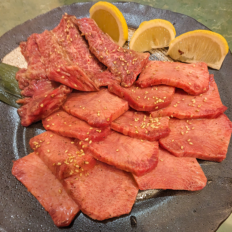 タンは肉厚で柔らかく旨味も十分。これに輪をかけて柔らかいのが特上ハラミだ。かなり厚みがあるので火を通すのに時間は掛かるが、塩味の場合、より肉の味わいがよくわかる。