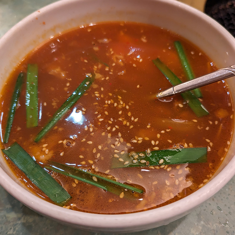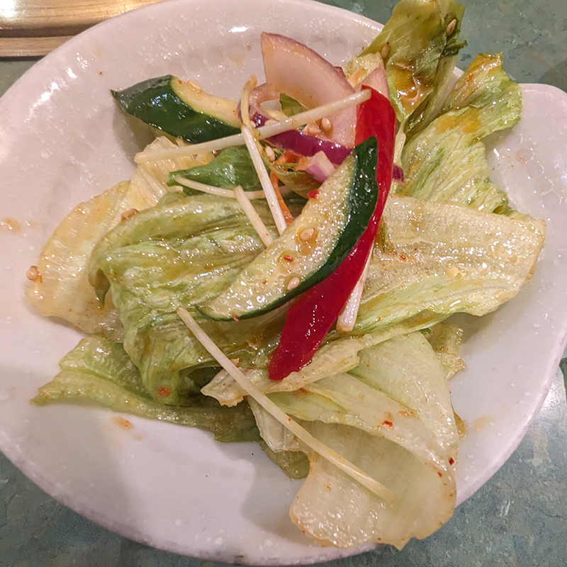 普段、口にするチョレギサラダとは異なる。本当は別の料理名ではないだろうか。ドレッシングがやや淡い赤色で軽やかな酸味が心地いい。中に入っているりんごがこの酸味と相まっていいアクセントになっている。油っぽさも感じられないところもいい。