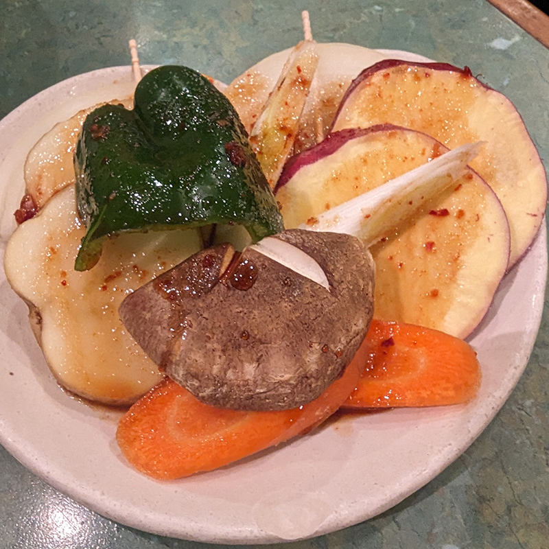 焼き野菜にもヤンニョムダレが合わさっている。ただし、肉と違い軽めのもの。じゃがいもとさつまいもと芋類が多い。